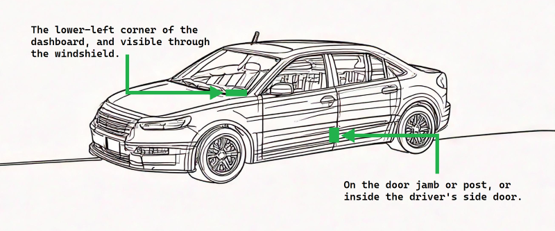 Your VIN is a 17-character code unique to your vehicle. It's typically found: